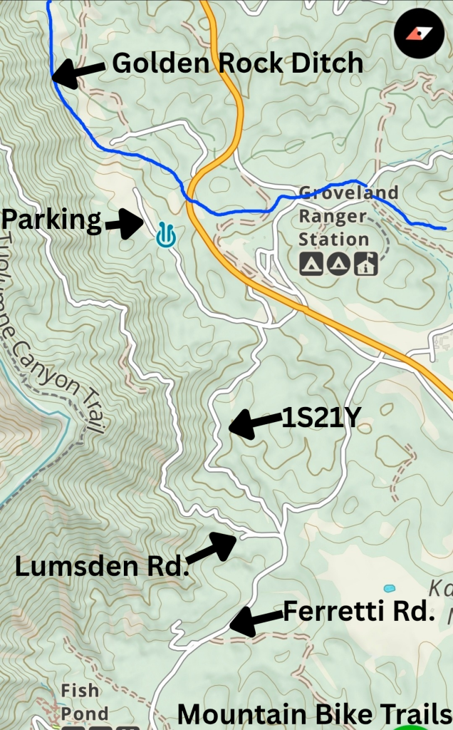 My starting point is where the old ditch intersects with the 120 just east of the Groveland Ranger Station entrance. I could park on the side of the highway to access it but I knew a more fun, albiet bumpier route. I head out driving east on Ferretti Road. I enter the forest and pass by the mountain bike trail system. In just a few moments I ascend east on Forest Route 1S21Y looking forward to my destination. I stop to “take a break” and I notice shotgun shells littering the ground. “Yep, this is a local’s favorite spot,” I think to myself.